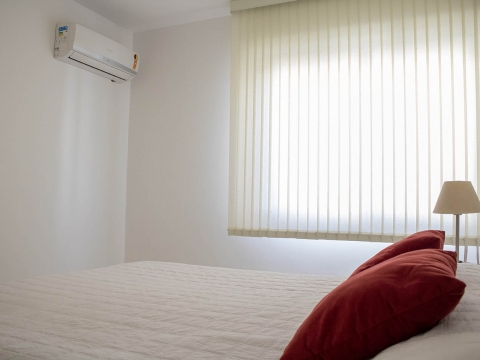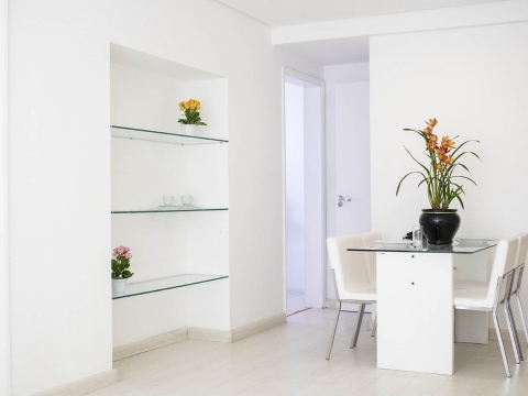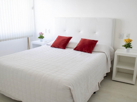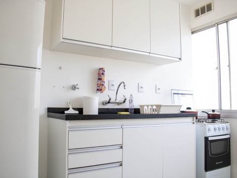 Nossos apartamentos de 56m² são mobiliados, com uma suíte com capacidade para duas pessoas, uma cozinha, uma sala e um lavabo.